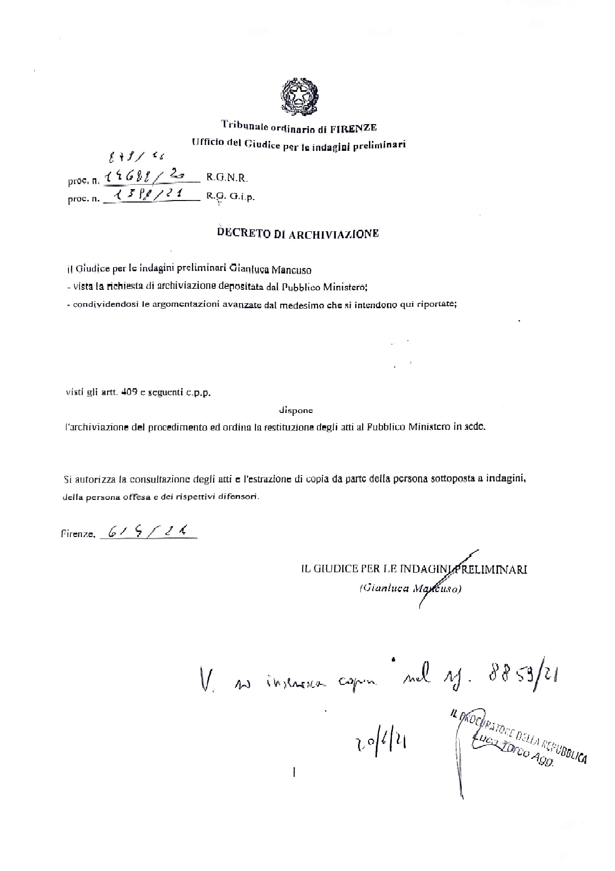 In 2021, the charges against Bevilacqua were dismissed by examining judge Gianluca Mancuso on request by Florence assistant District Attorney Luca Turco in violation of the Italian procedural law, since victims’ families were not advised of the request.