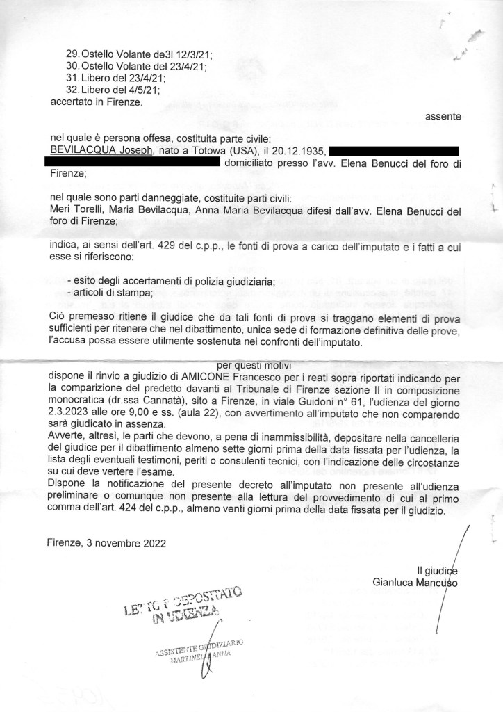 Between March 2018 and November 2023, Prosecutor Turco and the Carabinieri has not never made contact with the US authorities to ask for information on Bevilacqua’s past or send his DNA acquired by Siena DA’s Office. At that date, his home has never been searched for weapons or clues, regardless the existence of a probable cause for the Italian law.