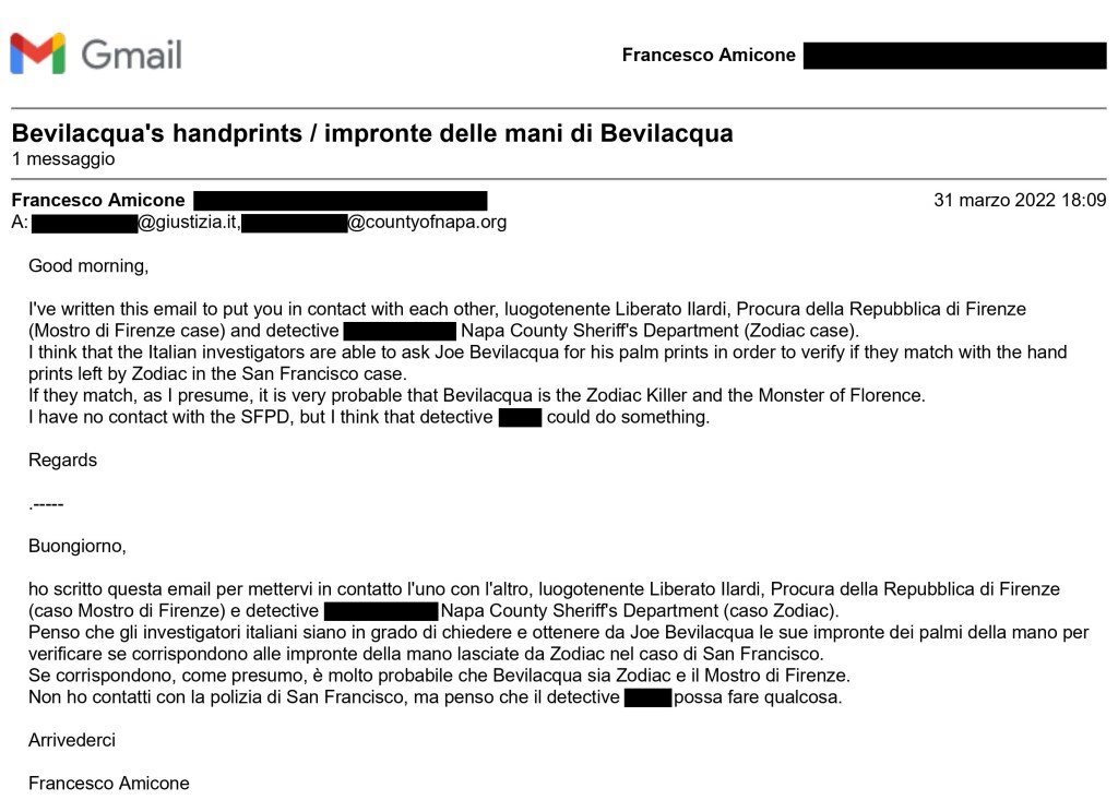 There also are other relevant documents up to the transmission I made of Bevilacqua’s genetic profile to the US law enforcement agencies that had jurisdiction on Zodiac’s homicides in November 2023. I obtained the profile for defensive purpose from prosecutor Nicola Marini, Siena DA’s office, who had Bevilacqua’s DNA collected in 2020. Although urged by my lawyers in March 2022, the Florence DA’s office chose not to sent Bevilacqua’s genetic profile to the US Authorities in charge of the Zodiac case.