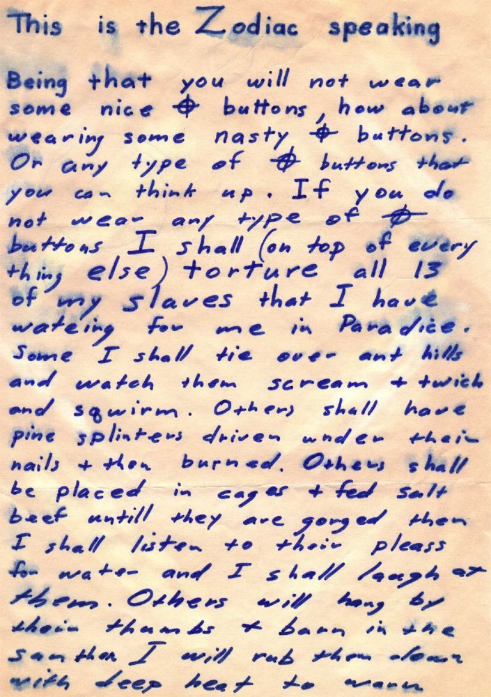 Non state indossando qualche bella spilla di Zodiac, e nemmeno di quelle brutte. O qualunque spilla di Zodiac che potreste immaginare. Se non ne indosserete una (al di sopra di tutte le altre cose) torturerò tutti i miei tredici schiavi che mi stanno aspettando in paradiso.